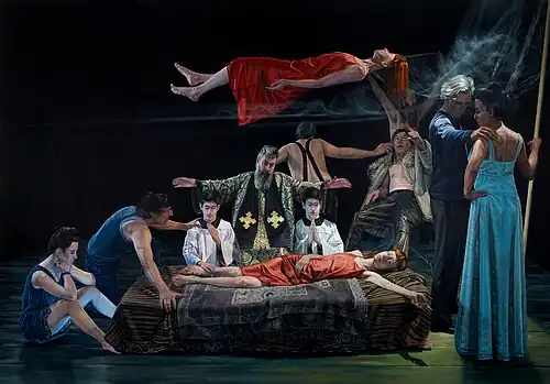 Kalaizis constructs his paintings, which are often elicited by dreams, with the aid of elaborate staging and by building up large scale scenes at the place of the imagined action. In this process a number of preliminary photographs are taken, from which the final painting is developed. His scenes sometimes appear to be surreal, but he unfolds their subject carefully over a long time. He writes down the ideas that will or will not surface in his paintings in form of a screenplay.[1] The result of this uncommonly slow creative process are painted images depicting idealized prospects and possibilities of inner worlds.