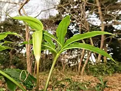 Plants in this section have tuberous underground stems with white interior and pedate leaves. Plant has auxiliary buds with accessory buds and sterile flowers on spadix appendages.[2][3]