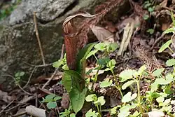 Arisaema serratum is a perennial. It produces two leaves, with 7-13 leaflets each.[2] The color of the flowering bract is variable, being either purple or green. It blooms from May to June.[1]