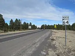 SR 64 was first designated as a state highway in 1932 as a route from Williams to the Grand Canyon.[2] In 1935, the highway was extended to the east from the Grand Canyon to US 89.[3] In 1961, the highway was extended further east from US 89 through Tuba City to the New Mexico state line.[4] In 1965, the portion from Teec Nos Pos was renumbered to SR 504 to match New Mexico,[5] which would be renumbered again in 1987 to US 64.[6] In 1965, the section to the east of US 89 became US 164,[7] and would later be renumbered to US 160 in 1969.[8]