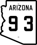 Arizona State Route 93, abbreviated SR 93, was a state highway in Arizona that existed from 1946 to 1991.[2][3] The route was co-signed with other highways along nearly all of its route from Kingman to the border at Nogales. SR 93 was the original designation for the highway from Kingman to Wickenburg, which was built in 1946. In 1965, the northern terminus of the state route was moved south to an unnamed desert junction with U.S. Route 89 just north of Wickenburg, and the southern terminus of U.S. Route 93 was moved south to the US 89 junction. The Arizona Highway Department sought U.S. Highway status for SR 93 across the rest of the state, but the proposal was never granted by AASHTO.[4] On December 17, 1984, the SR 93 designation was removed south of the Grand Avenue/Van Buren Street/7th Avenue intersection in Phoenix.[5] The route was completely decommissioned in 1991.[3]