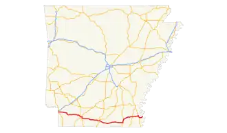 State Road 2 (AR 2, Ark. 2, and Hwy. 2) is a former east–west state highway in the Arkansas Timberlands and Lower Arkansas Delta. The route was approximately 195 miles (314 km), and ran from US Route 67 (US 67) in Texarkana east to cross the Mississippi River near Lake Village, continuing as Mississippi Highway 10.[2] On July 1, 1931, the route was entirely replaced by US Highway 82 (US 82) by the American Association of State Highway Officials (AASHTO). The route was maintained by the Arkansas Highway Department (AHD), now known as the Arkansas Department of Transportation (ArDOT).