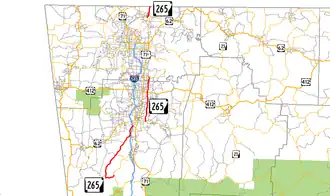 Arkansas Highway 265 (AR 265) is a designation for three state highways in Northwest Arkansas. The southern segment of 19.70 miles (31.70 km) runs from Highway 170 near Strickler north to Interstate 49 (I-49) in Fayetteville.[3] A second segment runs from Highway 16 in Fayetteville north to Highway 94 in Rogers.[4][5] Further north, a third segment of 3.324 miles (5.349 km) runs from Highway 94 in Pea Ridge north to the Missouri state line.[5] The highways are maintained by the Arkansas Department of Transportation (ARDOT).