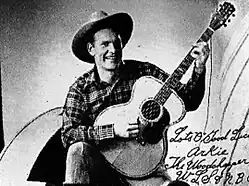 He was born in the Ozarks near Knob Noster, Missouri, to a family who owned a farm and a general store. He taught himself to play guitar and fiddle so he could play at local square dances,[4] and his first job in music was performing on radio in Kansas City on KMBC in 1928.[2] He started at WLS in 1930,[1] performing on their National Barn Dance, and became one of the show's most popular performers,[5][6] continuing there until 1959. During this time he also released records for Columbia Records and Conqueror Records. Book of sheet music 'THE ARKANSAS WOODCHOPPER'S WORLD'S GREATEST COLLECTION OF COWBOY SONGS WITH YODEL ARRANGEMENT' copyright 1931 published by M.M. Cole Publishing House, Chicago contains 35 songs, 64 pages. He once performed with Al Trace's orchestra with the song "Why Go Home?"[7] and although his recordings for Columbia, Gennett Records, American Record Corporation, Okeh Records sold well, he never established himself as a major musician.[8]