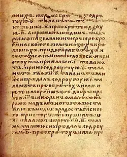 The manuscript was written by two scribes (according to the colophon, their names were — Michka and presbyter Peter), and also the third scribe (Jakim or Akim), who is responsible for the 175—177 sheets (with Sunday Gospel lessons) and the fourth, which name is unknown — who wrote only leaf 178 (Gospel lessons at date of Archangel Michael).[9] The handwriting of the two last scribes is dated palaeographically to the 13th–14th centuries.[7] According to N. N. Durnovo the fourth scribe was a contemporary for the first two scribes and dates its work to the end of the 11th century, or to the beginning of the 12th century.