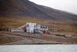 Meanwhile, Arktikugol was working on prospecting at Pyramiden.[21] Prospects were carried out at Kapp Heer during the winter of 1938–39, concluding with that there was only a single seam of coal. Barentsburg had a population of 1515 in 1939, of which 259 were women and 65 were children.[22] Grumant had a population of 399, of which 56 were women and 12 children.[23] By 1939 a town and mining complex was under construction at Pyramiden.[23] Production started in 1940, with a crew of 80 men.[24]
