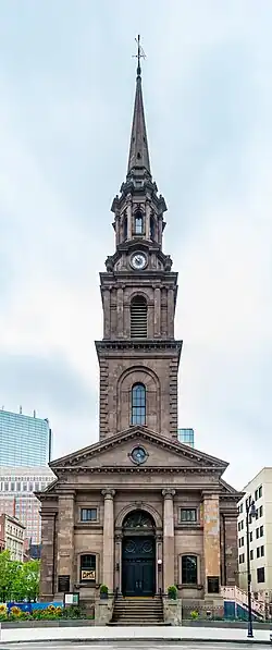 The Arlington Street Church is a Unitarian Universalist church across from the Public Garden in Boston, Massachusetts. Because of its geographic prominence and the notable ministers who have served the congregation, the church is considered to be among the most historically important in Unitarian Universalism. Completed in 1861, it was designed by Arthur Gilman and Gridley James Fox Bryant to resemble James Gibbs' St. Martin-in-the-Fields in London.[2] The main sanctuary space has 16 large-scale stained-glass windows installed by Tiffany Studios from 1899 to 1930.[3]