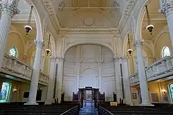 The sanctuary, with its Corinthian columns and graceful rounded arches, was modeled after the Basilica della Santissima Annunziata del Vastato in Genoa, Italy.[2] The panels on either side of the choir loft, containing the Ten Commandments and the Lord’s Prayer, were brought from the Federal Street Church, as was Dr. William Ellery Channing’s pulpit, which stands in the Hunnewell Chapel.[2] The box pews, made of chestnut with black walnut rails, were at one time deeded to members of the congregation. Enclosing each pew signified that they were privately owned, and also kept cold drafts from blowing in from the aisles during the winter season.[2]