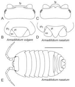 Armadillidium nasatum can reach lengths of up to 21 millimetres.[2][5] Like Armadillidium depressum, it does not form a complete ball when enrolled.[2] Though similar in outwards appearance to Armadillidium vulgare in dark grey color, the main distinguishing feature is a rectangular-like protrusion ("nose") towards the apex of the head. The tail (telson) has a rounded tip with incurved sides, as opposed to most genus Armadillidium species which have a smaller, flat tail.[5] Pale longitudinal stripes spanning from head to rear are seen on some individuals, though this is variable and is not a diagnostic feature.[6]
