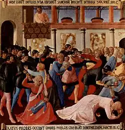 After 1460 Fra Domenico da Corella recorded the panels in his Theocoton as works by Fra Angelico. All the later historic sources (Albertini, Billi, Anonimo Gaddiano) ascribe the entire work to Fra Angelico. The one exception is Manetti, who speaks of "almost" all the tabernacle as being an autograph work by Fra Angelico. Vasari attributed the whole work to Fra Angelico, but argued it was produced in his youth, a conclusion also followed by all 19th-century art historians. Modern art historians place it instead at the end of the artist's life, proposing collaborators for the non-autograph panels such as Domenico di Michelino (Berenson), the Master of Cell 2 (Pope-Hennessy[3]), Zanobi Strozzi and Benozzo Gozzoli (Salmi). The autograph panels include Annunciation, Nativity, Flight into Egypt and Massacre of the Innocents.