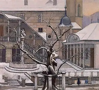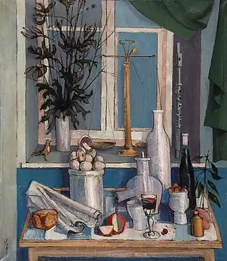 Being an admirer of the art of the Middle Ages and the Renaissance, Armand Niquille used old painting techniques such as tempera. He also attached a particular importance to the laws of composition and to the rigorous organization of space, using the traditional mise au carré, a method learned at the Technicum.[7] A member of the Society of Swiss Painters, Sculptors and Architects (SPSAS, now Visarte), he regularly participated in collective exhibitions of this group. Even though Niquille distanced himself from twentieth-century artistic movements, his pictorial creation nevertheless bears witness to modernity.