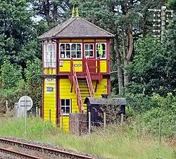 The station's signal box was built by the Midland Railway and placed in service on 16 July 1899. It was equipped with a 16-lever tumbler frame. The box was decommissioned on 15 January 1983. During 1992, it was restored by the Friends of the Settle to Carlisle Line.[5][6] The refurbishment saw the signal box furnished with original Midland Railway block instruments and painted in original colours. It can be visited on Sundays by prior arrangement.[7]