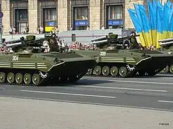 The number of vehicles is around 2,000, the number of tanks is around 700 and the number of artillery pieces is around 560.[22] Turkmen ground forces equipment includes 702 T-72,[23] and 10 T-90, ordered in 2009 for approximately $30 million.[24][25] AIFV / APC include BTR-60/BTR-70/BTR-80 - 829,[23] BMP-1/BMP-2 - 930,[23] BRM-1 12, and BRDM-2 - 170. In 2021 Turkmenistan is to receive batch of Lazar 3 8x8 armored vehicle from Serbia.[26]