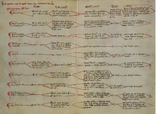 Armengaud's Aphorismi survives in a single manuscript. It contains some two dozen gnomic statements on diet and urine, modelled on the Aphorisms of Hippocrates and the Parabole medicationis of Arnau, which his uncle completed in 1300.[7] Armengaud's Tabula antidotarii is a table of a medicinal compounds that survives in seven manuscripts. There is a lot of variation between copies. The number of compounds contained in the table varies from 49 to 73.[8] The original probably contained 68.[9] There are six columns in the table. One for the name of the compound and five for its constituents, physical characteristics, medicinal properties, dosage and manner of administration. From an early date, the Tabula was thought to be derived from the Antidotarium Nicolai, but it seems to be an independent work.[8] In 1306, following the expulsion of the Jews from France, the Tabula antidotarii was translated into Hebrew in Barcelona by Estori ha-Parḥi, a friend of Jacob ben Machir.[10] There are three copies of the Hebrew translation.[11]