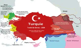 The Treaty of Sèvres was concluded on August 10, 1920. Armenia, represented by the delegation led by Avetis Aharonian, was present at the negotiating table and among the signatories.[53] The treaty partially satisfies the Armenian delegation, as it obligates the Ottoman Empire to recognize Armenia as a free and independent state (Article 88) and to submit the question of the border between the Ottoman Empire and Armenia in the vilayets of Erzurum, Trebizond, Van, and Bitlis to the President of the United States for resolution (Article 89). However, the Treaty of Sèvres does not mention Cilicia. Additionally, Boghos Nubar Pasha and the Armenian National Delegation are present, and the former jointly signed a protocol with Avetis Aharonian, which guarantees the freedoms, notably cultural and religious, of minorities in Armenia.[53]