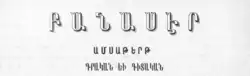 | Khardots[11][14] | Խարտոց | "File" | Satirical weekly | 1926-1927 | Paris | ![]() |