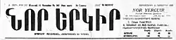 | Nor yerguir[11][10] | Նոր երկիր | "New Country" | Organ of the French branch of the Social Democrat Hunchakian Party | 1926-1937 puis 1954-1955 | Paris | ![]() |