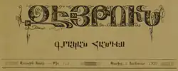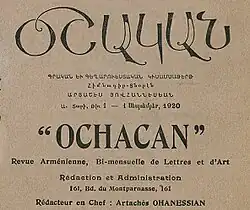 | Ochacan[5][10] | Օշական | "Oshakan" | Bi-monthly magazine | 1920 | Paris | ![]() |