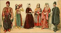 The traditional clothing of some Western Armenian provinces, namely those around lake Van, was a regional form of dress rather than an ethnic one, as many neighboring peoples such as Kurds also dressed in a similar fashion. However, as Armenians had a virtual monopoly on weaving and dress-making in the region, coupled with the fact that Armenians were the oldest living inhabitants of the area, it is likely that it was adopted from Armenians by the neighboring peoples.[12]