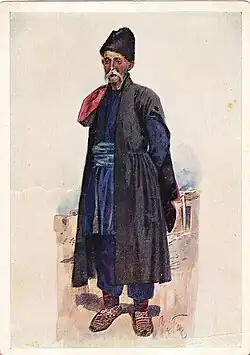 With a number of similarities to the Arkhalugh, the Chukha (Armenian: չուխա) had a wider functional purpose. The Chukha is a male humeral outerwear with layers and gathers that was detachable at the waist. It was made of cloth, tirma, and homespun textiles. Outerwear served not only as warm clothes, but as clothing for special occasions.[8] Most chukhas were decorated with a bandolier for gazyr cartridges on both sides of the coat, although Armenians would seldom wear the chukha with the cartridges inserted. The right to wear a chukha symbolized a certain socio-age status, as a rule, it was worn from the age of majority (from 15 to 20 years). The Chukhas were dressed in a mushtak or burka, and later as an urban influence. Sheepskin fur coat or mushtak as clothes were worn by the wealthy, mainly of the older generation.[2]