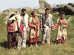 On top of the top were worn short (up to the waist) swing clothes with short sleeves – Kazakhik made of goat fur or felt aba. The goat's jacket, covered with braids at the edges and with bundles of fur on its shoulders, was worn mainly by wealthy villagers.[14]