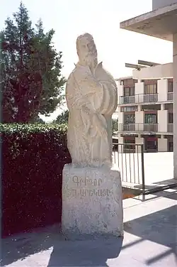 Between the two historical buildings of the Melkonian Educational Institute, there is the white marble Mausoleum of the immortal benefactors, Krikor Melkonian and Garabed Melkonian; its foundation stone was laid on 24 April 1954 by Bishop Ghevont Chebeyan, who unveiled it on 15 January 1956. On the buildings' sides facing the Benefactors' Mausoleum are the twin sandstone monuments for the Armenian Alphabet and Mother Armenia; they were unveiled by AGBU President Alec Manougian. Between the old and the new buildings, there is a series of sandstone statues depicting important pillars of Armenian history and letters: (great Armenian marine painter Hovhannes Aivazovsky, first Armenian printer Hagop Meghabard, great Armenian musician, composer and conductor Gomidas Vartabed Soghomonian, inventor of the Armenian alphabet Saint Mesrob Mashdots, Armenian national hero, freedom fighter and military commander General Antranik Ozanian, great Armenian poet and Melkonian teacher Vahan Tekeyan and great Armenian historian of the "Golden Century" Movses Khorenatsi), all placed between 1990–1991. Finally, in front of the new boarding section there is the white marble bust of then AGBU President Alec Manougian, placed there in 1990; the sandstone statues and the marble bust are the work of Armenian sculptor Levon Tokmadjian, who chiselled them on site, at the request of Headmaster Vahe Gabouchian.