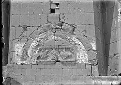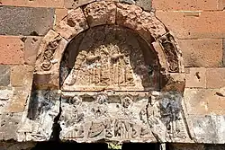 The 9th–11th centuries Armenian sculpture is rich in images of patrons. On the tympanum of the main entrance of the church of Yerznka (near Ani) (895) were depicted two princes on horseback before the Virgin and Child and accompanied by angels (destroid). In the second half of the 10th century, the high relief figures of the crowned princes Gurgen and Smbat Bagratuni were depicted on the eastern facades of the main churches of Sanahin and Haghpat monasteries (St. Amenaprkich church 966, St. Nshan church 976).[10]