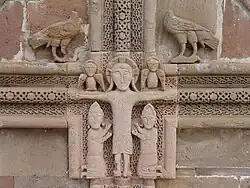 Armenian medieval sculptures are sculptures created in the medieval period. They are most present on or in churches, martyries, and free-standing monuments, such as four-sided stelae and khachkars (cross stones). The popularity of sculpture in the Armenian medieval art was due to midis- a three-layer layout of stones, when two rows of hewn stones were joined with lime mortar, and the surface got an artistic treatment.[1]
