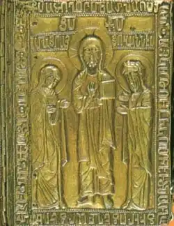 In the field of silver production, the Byzantine influence on Armenian jewelry art was first brought to the attention of the 19th-century French Armenist A. Carrier. This idea was further developed in the works of G. Hovsepian, S. Der Nersessian, A. Kurdanyan, A. Khachatryan, and N. Stepanyan. Nevertheless, according to A. Y. Kakovkin, the majority of Armenian monuments of silverwork from the 11th to the 15th centuries, despite the presence of points of contact, exhibit a vivid originality and independence from Greek works.[133] In addition to jewelry art, Byzantine elements (for example, the Deesis motif)[134] entered other branches of fine arts in Armenia, particularly miniature painting.[135] The Byzantine influence becomes most noticeable in the miniatures of Cilician Armenia during the late 12th to early 13th centuries.[136]