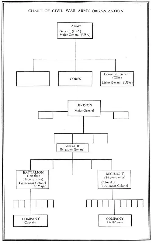 Prewar Federal mounted units were organized into five Regular regiments (two dragoon, two cavalry, and one mounted rifle), and one Regular cavalry regiment was added in May 1861. Although the term "troop" was officially introduced in 1862, most cavalrymen continued to use the more familiar term "company" to describe their units throughout the war. The Federals grouped two companies or troops into squadrons, with four to six squadrons comprising a regiment. Confederate cavalry units, organized in the prewar model, were authorized 10 76-man companies per regiment.[11] Some volunteer cavalry units on both sides also formed into smaller cavalry battalions. Later in the war, both sides began to merge their cavalry regiments and brigades into division and corps organizations.