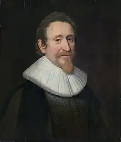 After some political maneuvering, the Dutch Calvinists were able to convince Prince Maurice of Nassau to deal with the situation.[9] Maurice systematically removed Arminian magistrates from office and called a national synod at Dordrecht. This Synod of Dort was open primarily to Dutch Calvinists (102 people), while the Arminians were excluded (13 people banned from voting), with Calvinist representatives from other countries (28 people), and in 1618 published a condemnation of Arminius and his followers as heretics. The Canons of Dort responded, among other topics, to Arminian doctrines, anticipating their later articulation as the Five points of Calvinism.[10]