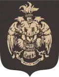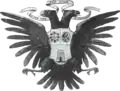 Coats of arms of the Kastrioti (1451–1904) The coat of arms of Skanderbeg with the double-headed eagle appears for the first time in a book of greetings given to Skanderbeg by Alfonso V, King of Naples, on the occasion of the signing of the Treaty of Gaeta on 26 March 1451.[32] It was handed over by the king's protonotary, Arnaldo Fonoleda, to the ambassadors of Skanderbeg who signed this treaty, Bishop Stefan of Kruja and Father Nikola Berguci. The representative symbol of the state of Skanderbeg appears again in a Venetian catalog of coats of arms in 1463, when Gjon Kastrioti II, Skanderbeg's son, received the title "Noble of the Republic". The red and black colors in the coat of arms are mentioned in Marin Barleti's "The history of the life and deeds of Scanderbeg, Prince of Epirus" (Latin: Historia de vita et gestis Scanderbegi Epirotarvm principis), page XV, published in 1508 – «nā rubea uexilla nigris/& bicipitibus distincta aquilis (id gētis insigne erat) gerebat Scanderbegus».[33] The usage of the same colors is later reaffirmed in Giammaria Biemmi's work "The History of Giorgio Castrioto Scander begh" (Latin: Istoria di Giorgio Castrioto detto Scander begh) who quotes the Antivarino of Bar in page 22, published in 1756 – «L'insegna di Scander begh era un' aquila negra distincta in due teste sopra campo rosso».[34] Monthly publication "Ylli" magazine, in its 3rd annual edition, issue no.11, dated November 1962, published an article (p. 26–27) by Dhimitri Pilika [sq], a noted scholar of pelasgian antiquity, titled "Searching for "ALBANICA" through foreign archives and libraries...". The article references the official seal of Skanderbeg being discovered in Prague, Czechoslovakia, in 1961, by the widow of Stanislav Kostka Neumann, a czech writer and expert in Albanian studies. It was part of the materials belonging to slovak philologist Pavel Jozef Šafárik, who in turn had acquired them from the Ragusa Archives. Dating back to the year 1466, the seal is portrayed as such:[35]