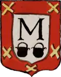Coat of arms of the Minotto (16th century) Crollalanza traces the origins of the Minotto family to Albania, noting that it was among the noble families involved in the governance of Venetia at its foundation.[62] Graf Demetrius Minotto, in his 1901 biography of the Minotto, published in German, contends that his lineage descended from Drivasto.[63] The family was officially recognized as part of the Venetian patriciate with the cessation of the Maggior Consiglio in 1297, as cited by De Totto. Over the centuries, its members distinguished themselves as military leaders, administrators and statesmen. Notable figures include Tommaso, who in 1265 commanded the Gulf fleet against the Genoese; Marco, who in 1300 led a fleet of 37 galleys against the Greeks, captured the island of Stalimene and returned to Venetia with spoils and prisoners; and Pasqualino, who in 1364 was sent to Candia to reclaim the island from rebellious noble colonists. Another Tommaso served as one of the supercomites in 1369, joining Doge Andrea Contarini in the campaign to retake Chioggia. In 1448, Girolamo Minotto was captain of Vicenza and by 1453, was serving as bailiff in Constantinople. When the city fell to the Ottomans, he and his son were captured and brutally executed. In modern times, Giovan Pietro Minotto, president of the Royal Venetian Institute in 1866, authored the "Technological Dictionary" and invented a telegraphic device that was widely adopted in Italy and abroad.[64] A limestone plaque, mounted on the last corner pillar to the right, on the ground floor of the Loggia, is attributed to Podestà and Captain Castellano Minotto (1463–1464). Below the shield, the inscription bears the date MCCCCLXIIII, marking the completion of the building's construction and the end of Minotto's regency.