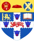Escutcheon: Per pale, Gules and Azure, a saltire Argent cantoned between an antique crown in chief Or and three cinquefoils Ermine in the flanks and base; on a chief Or a wave-packet Sable between two open books proper, fore-edges and binding of the First The arms contain elements of those of two predecessor institution the Royal College of Science and Technology and the Scottish College of Commerce. The royal crown and Scottish saltire are from the former and the books representing learning are from the latter. The wave packet linking the books indicates technology. The three cinquefoils and the partial red background of the shield reference the ancient kingdom of Strathclyde and the blue background modern Scotland. The crown signifies both the ancient kingdom and a royal connection through the grant of royal status to then Royal Technical College in 1912.[63] | |