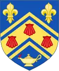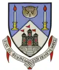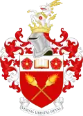 Escutcheon: Barry wavy of six argent and azure, a cross moline gules; on a chief of the last an open book proper clasped Or inscribed with the words 'Quaerenti Ostium', in Roman characters sable between two domed towers also proper, that to the dexter ensigned with an increscent of the first and that to the sinister with an estoile, also Or. The Latin text on the book (of knowledge) Quaerenti Ostium means 'an entrance for the seeker'. | |