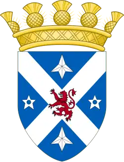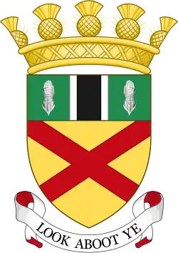 Blazon: Quarterly 1st Gules three crowns of myrtle Or 2nd Argent on a mount in base the figure of St Andrew Proper bearing his cross in front of him Argent 3rd Argent on a base undy Azure and Argent a lymphad sails furled Sable flagged Gules 4th Gules in chief a garb Or banded Vert in base a plough also or share Argent. |