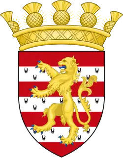 Blazon: Argent on a mount in base a stag lodged reguardant in front of an oak tree all Proper the tree charged of an inescutcheon of the arms of the Earl of Lauderdale (Or a lion rampant Gules couped at all his joints of the field within the Royal Tressure Azure). |