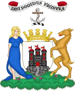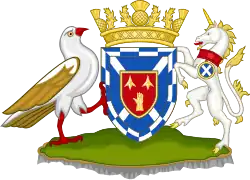 Blazon: Quarterly 1st Sable a bend bretessed accompanied by six billets Or three in chief and three in base 2nd Gules a stag's head erased with a cross-crosslet fitchee between the attires Or 3rd per pale Gules and Sable in a sea in base undy Argent and Azure a three-masted ship of the 17th century Or in full sail Proper flagged Gold 4th per fess engrailed Azure and Vert in chief a demi-angel Proper attired Argent wings displayed Or and celestially crowned Or holding in either hand a palm branch Vert and in base a bend wavy Argent charged with a bendlet wavy Azure. |