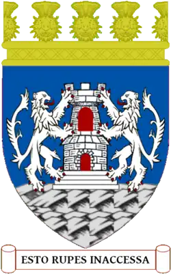 Blazon: Azure on a rock Proper two lions supporting a tower with four steps Argent masoned sable windows and portcullis Gules. |