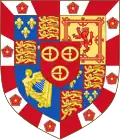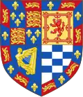 Quarterly: I and IV, grandquarterly azure three fleurs de lys or (France modern) and gules three lions passant guardant or (England); II, or, a lion gules, double tressure flory and counter-flory of the same (Scotland); III, a harp or, stringed argent (Ireland); a baton sinister couped gules, charged with three roses argent, seeded and barbed vert, brochant sur-le-tout. |