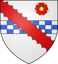 Or a fess chequy argent and azure, a bend engrailed gules brochant in chief a rose of the same.[1] |