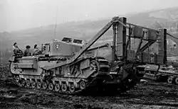 During World War II, the AVRE was provided with a platform allowing a fascine to be carried on the vehicle front while the turret was traversed through 90 degrees. This could be released from within the vehicle to drop into gaps and ditches, allowing tanks (commencing with the AVRE itself) to cross, or angle up and over a ridge.