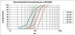 The accompanying graphs offer an overview of all stone classes. A distribution between the two curves in the graph fulfils the criteria for category B. Furthermore, for category A compliance, the MEM should intersect the short horizontal line. MEM represents the average stone mass, meaning the total sample mass divided by the count of stones in that sample. It's worth noting that in wider ranges, notably 15-300 and 40-400, there's a considerable difference; for the 15-300 class, M50 is 1.57 times the MEM.[3][4]