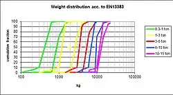 Armourstone is available in standardised stone classes, defined by both a lower and upper value of the stone mass within these classes. For instance, Class 60-300 signifies that up to 10% of the stones weigh less than 60 kg (130 lb) and up to 30% weigh more than 300 kg (660 lb). The standard also mentions values which shouldn't be exceeded by 5% or 3%.