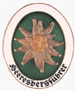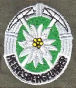 A machine embroidered oval cloth badge, it displays an edelweiss in front of two crossed ice axes, on a green background. Surrounding this is a grey wreath with the wording 'HEERESBERGFÜHRER' on its lower portion.[8]