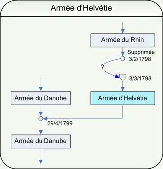 The Army of Helvetia, or (French: Armée d'Helvétie), was a command of the French Revolutionary Army. It was formed on 8 March 1798 from the remnants of the first unit to be known as the Army of the Rhine. It was officially merged into the command structure of the Army of the Danube on 29 April 1799, although it continued to operate in the Swiss theater until 1801. The Army's initial campaigning in the old Swiss Confederation resulted in severe setbacks and defeats at Feldkirch, Lusiensteig, and Zurich.