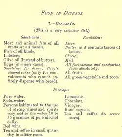 Cantani's exclusive animal food diet consisted of all kinds of meat and animal fats, fish, lobsters and eggs but no dairy as it contains lactose.[10] A list of sanctioned and forbidden foods on Cantani's diet was included in Isaac Burney Yeo's book Food in Health and Disease, published in 1896.[10] Bernhard Naunyn was influenced by the Cantani system.[5]