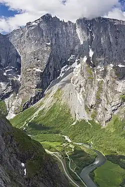 Heen is known for several first ascents, and his many ascents of Romsdalshorn, including the first winter climbing of the mountain. He was Norway's leading mountaineer from the 1920s to the 1950s.[6][1][7] Heen was largely autodidact in mountaineering, and an unconventional outsider to a sport defined by Norsk Tindeklub in Oslo's western suburbs.[8] He did not have a single accident during his life in the mountains.[5] In 1926 he climbed solo (alone) the south wall of Romsdalshorn, at the time a groundbreaking achievement. Heen had several times attempted Trollryggen, a 2 kilometer long pillar at the edge of Trollveggen. One attempt was in the summer of 1940 with Arne Næss. In 1958 he finally succeeded together with Ralph Høibakk, their only equipment was rope, 10 pitons, 6 carabiners and a hammer each. Ten years later, with improved equipment, the two climbed the route in only 10 hours.[8] In 1984 he was one of the guides for Carl Boenish and his wife during their BASE-jumping in the area.[9]