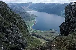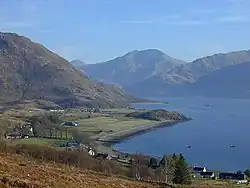 Arnisdale (Scottish Gaelic: Àrnasdal) is a hamlet in the historic county of Inverness-shire in the local authority area of Highlands of Scotland.[1] It lies on the north shore of Loch Hourn, around 10 miles (16 kilometres) down a single-track road from Glenelg. It has a permanent population of around 30 and several holiday cottages. At the end of the community is a large white-painted hunting lodge called Arnisdale House, built by architects Robert John Macbeth & Alexander Ross in 1898–1916.[2][3][4][5] The house was built for Valentine Fleming of the banking family (father of the writer and explorer Peter Fleming and of Ian Fleming, creator of James Bond), who was killed in action in World War I, a year after the house was completed.