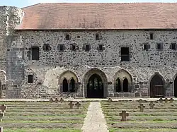 The cloister, or inner yard, is surrounded by the Bursenbau, the church ruin, the main abbey building (1775), and the early Gothic eastern wing (Ostflügel) that housed the dormitory for the brothers on the upper floor and the chapter hall, which doubled as the burial site of the abbots, on the lower floor. The former was demolished in the 19th century, but has been reconstructed and now serves as a venue for concerts. The latter has become part of the war grave cemetery, with a memorial to the war dead. The war cemetery now occupies the cloister, where rows of graves are interspersed with crosses made of Basaltic tuff.[26]